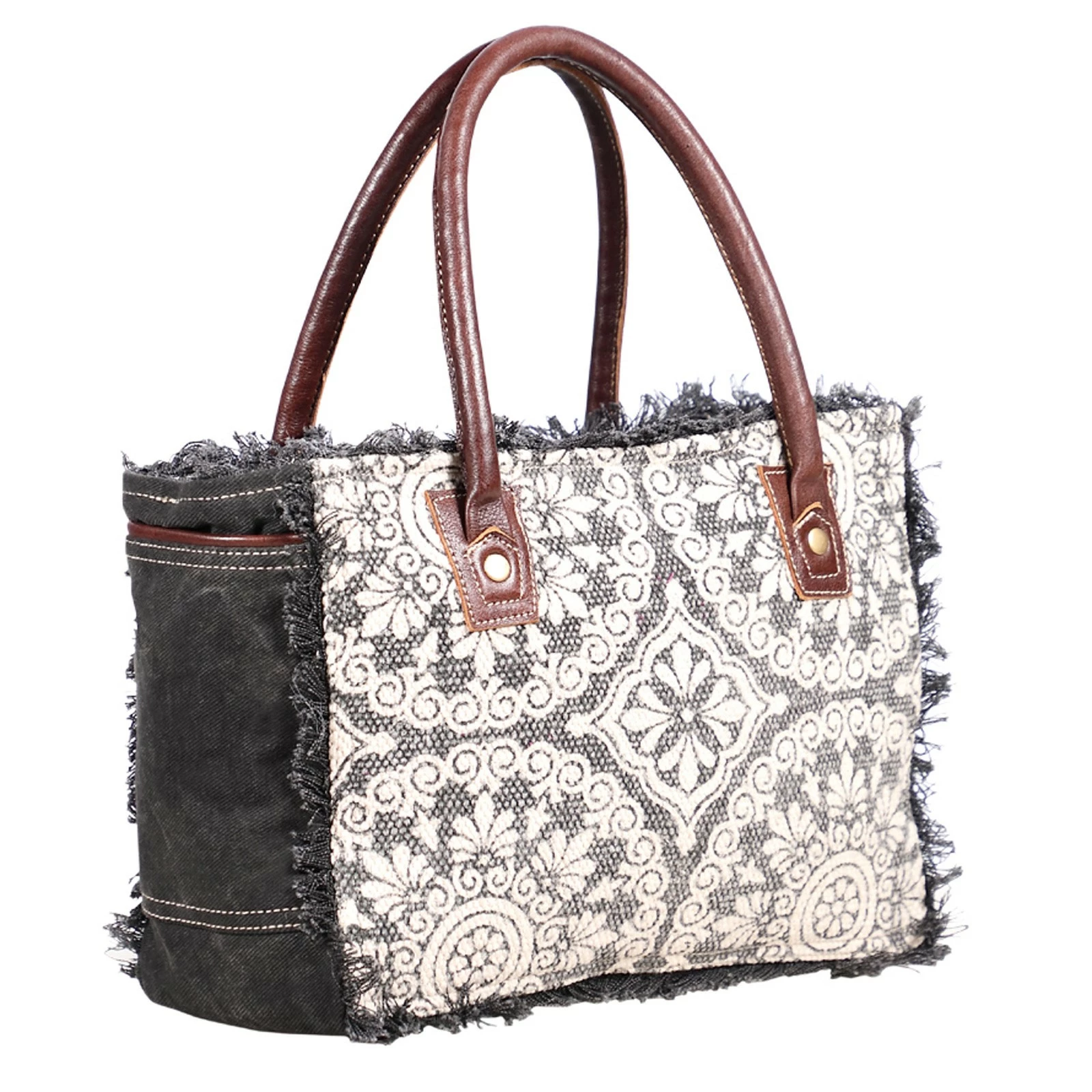 Myra Bag, Yarny Tote Bag. A great option for travel and every day, this tote from Myra Bag is crafted from canvas and designed with an antiquated pattern on a weathered background. It has two pockets on the interior, including one pocket secured by a magnetic closure.