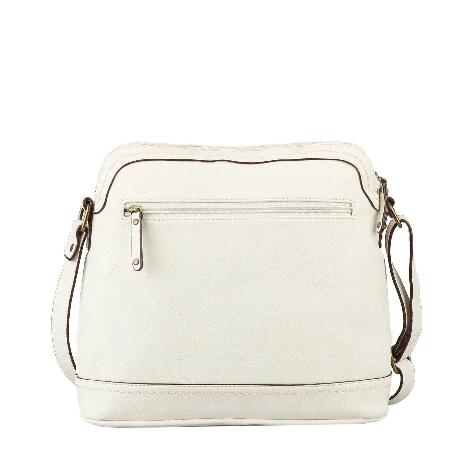 - Exterior features 1 front zip pocket, 1 front half moon-shaped zip pocket with interior card organizer and 1 back zip pocket
